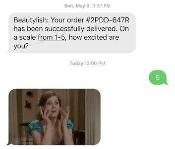 Beauty brand Beautylish not only sends a delivery confirmation message, but they also encourage recipients to reply by asking them to rate how excited they are for their order. If the recipient responds, they receive a gif from the brand.