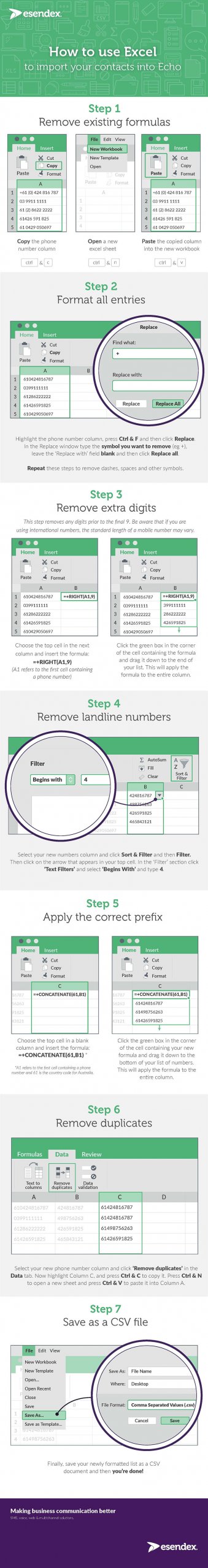 Does your customer database have telephone numbers entered with different formatting? Perhaps some with the +61 country code, some with (0) and some starting with 614. Or do you have mobile phone numbers ending up in the columns for home or office numbers, or vice versa? If you are nodding your head, we extend our sympathies and warmly welcome you to the club! We know the pain of having to work with an uneven data set, hence we’ve created this infographic to guide you, step by step, on how to clean and reformat telephone numbers in Excel so that you can have a telephone list that is accurately and consistently formatted. And even though we create this with our Echo users in mind, it’s useful for any application or platform that needs consistency, so share with anyone who may have the same challenge!