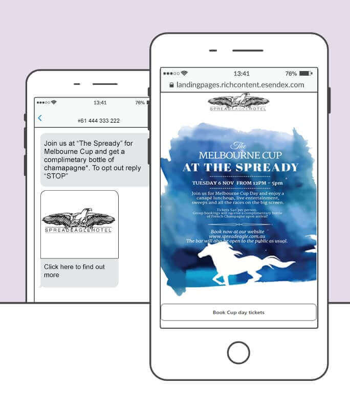 So in preparation for the Melbourne Cup day, the Spread Eagle Hotel sent an SMS Landing Page message to their members. This involved using our Messaging Studio to build a tailored web page that is specifically designed for mobile users, with a clear call-to-action button to guide recipients to take the desired action.